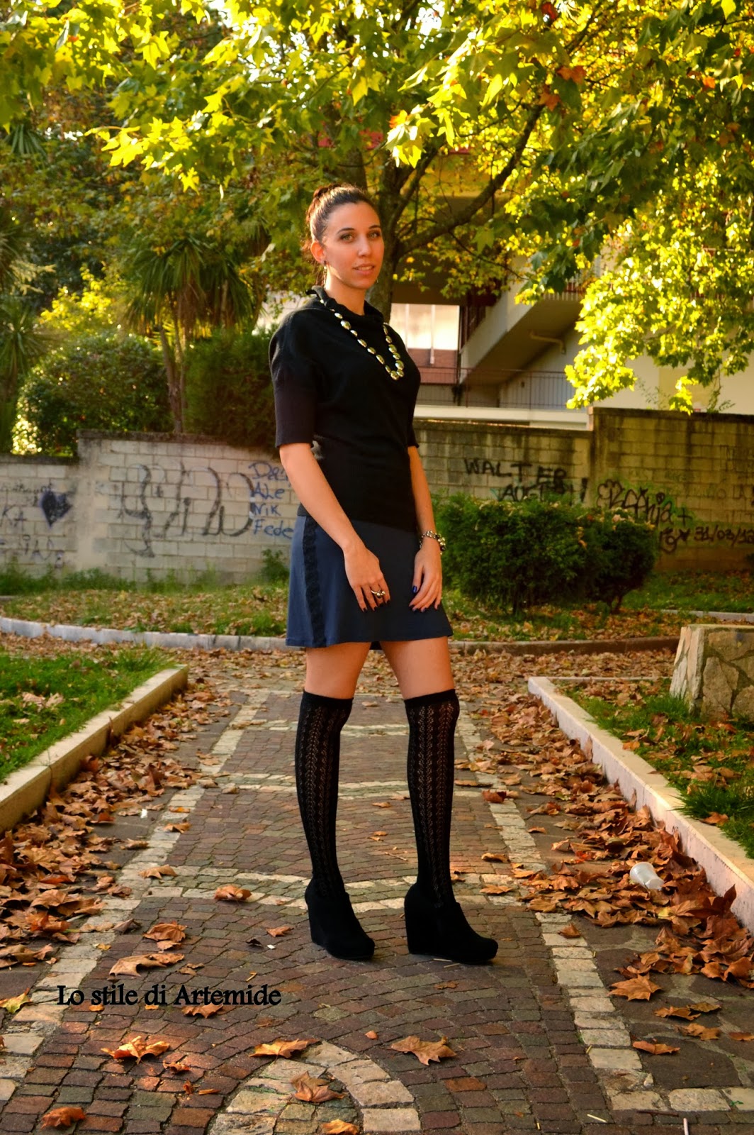 You don’t imagine how long ago I bought these over-the-knee socks, main of this look. I bought them two years ago in Florence, but I never wear: but their tricot texture is so hypnotic! Why it took me so long? Because I worry cold legs! Over-the-knee socks are a strange item: it can not be worn if it is hot but not if it is too cold, it is perfect for midi seasons, and autumn is finally right for me. Heat weather of these days in Italy, however, invites me to create an outfit: the one you see as the skirt is actually a dress, which , with the soft-necked sweater worn above, becomes a skirt. On dress/skirt side is embellished with strips of lace fabric, which make it even more romantic look. Since black and blue are very dark and winter’s colors, I did not make too darked this look, I solved problem adding bright accessories such as parure ring and bead bracelet steel, and stone-mirrored necklace. Do you remember the bag with the micro studs? I’ve worn here with my little black dress. And what could be more romantic hairstyle such an high bun? Create a high ponytail, divide it into two strands and then twist them, so wrap around the base of the tail into a bun. For this look dare and play are key verbs: Dare wearing over-the-knees socks, so delicate, romantic but also very sensual, and play overlapping clothes to have new looks! try to mix with each other! Did you try to reinvent in this way your wardrobe?