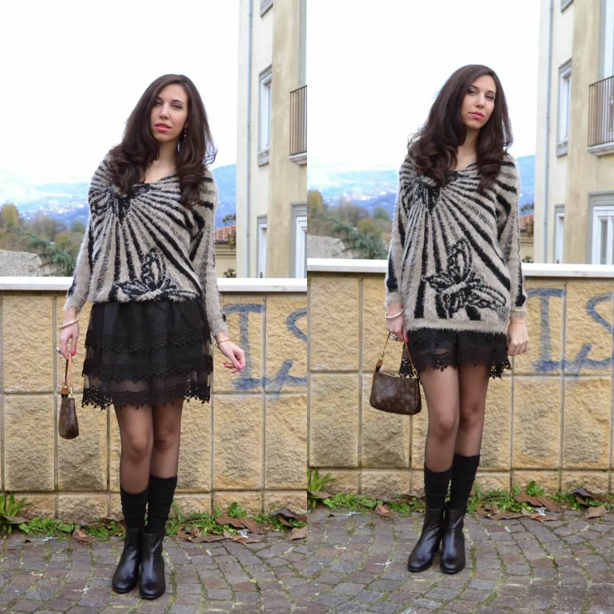 Sweater and skirt are by Molly Bracken, a French bon ton brand, where lace, tulle, wool, and cotton are mixed to create ultra-feminine and trendy look. This result is a style bon-ton French like, where elegance skirt is moderated by soft sweater. Ankle booties and socks above ultra-sheer stockings help to propose a casual-chic style. I paired a Louis Vuitton clutch. To finish my romantic mood, beige and gold accessories: cocktail ring seen here, thin bangles and bangle with Paris simbols. Can you see them?