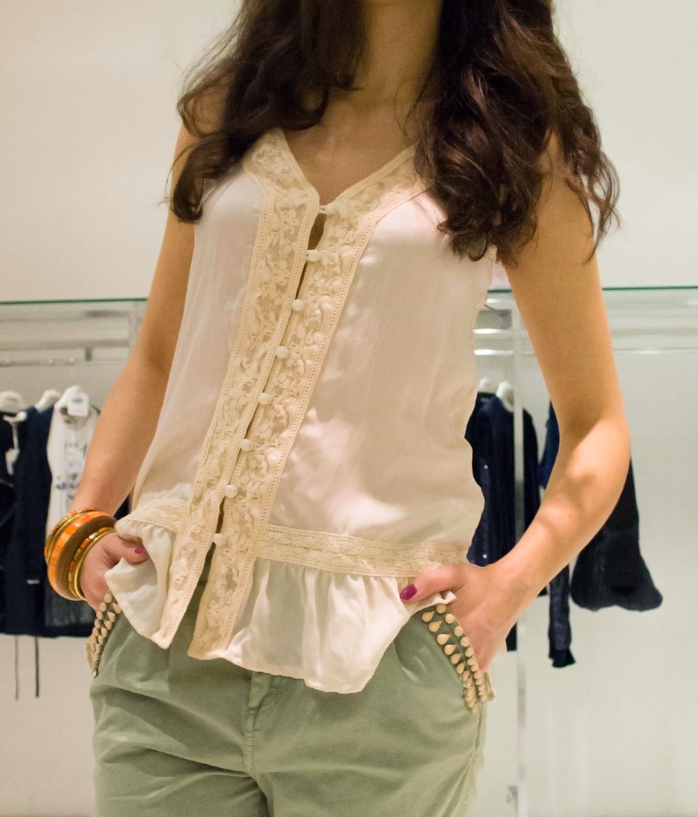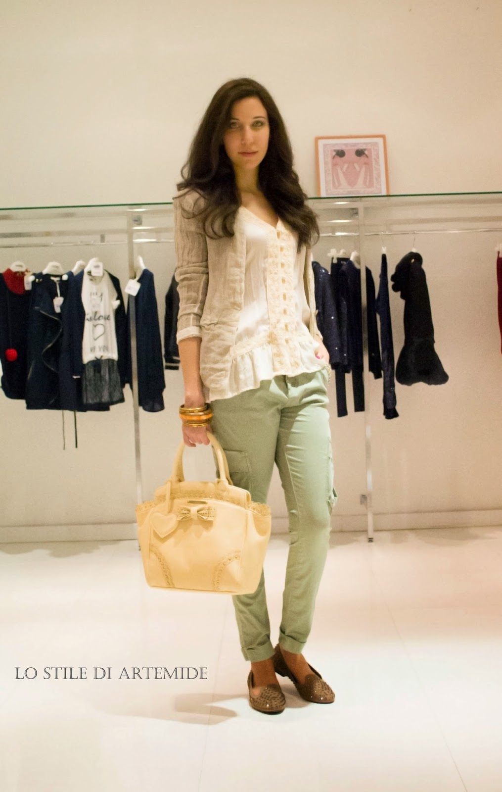 For the first look I chose very romantic and casual items. A soft pink top, with strips of lace and pattern buttons paired with a comfy green pants “chino” with maxi-pockets, embellished with small pink buds on the upper part. As jacket I chose a light brown embossed fabric one and as accessories an handbag, with bow and small studs and wood and metal bangles on my arms.