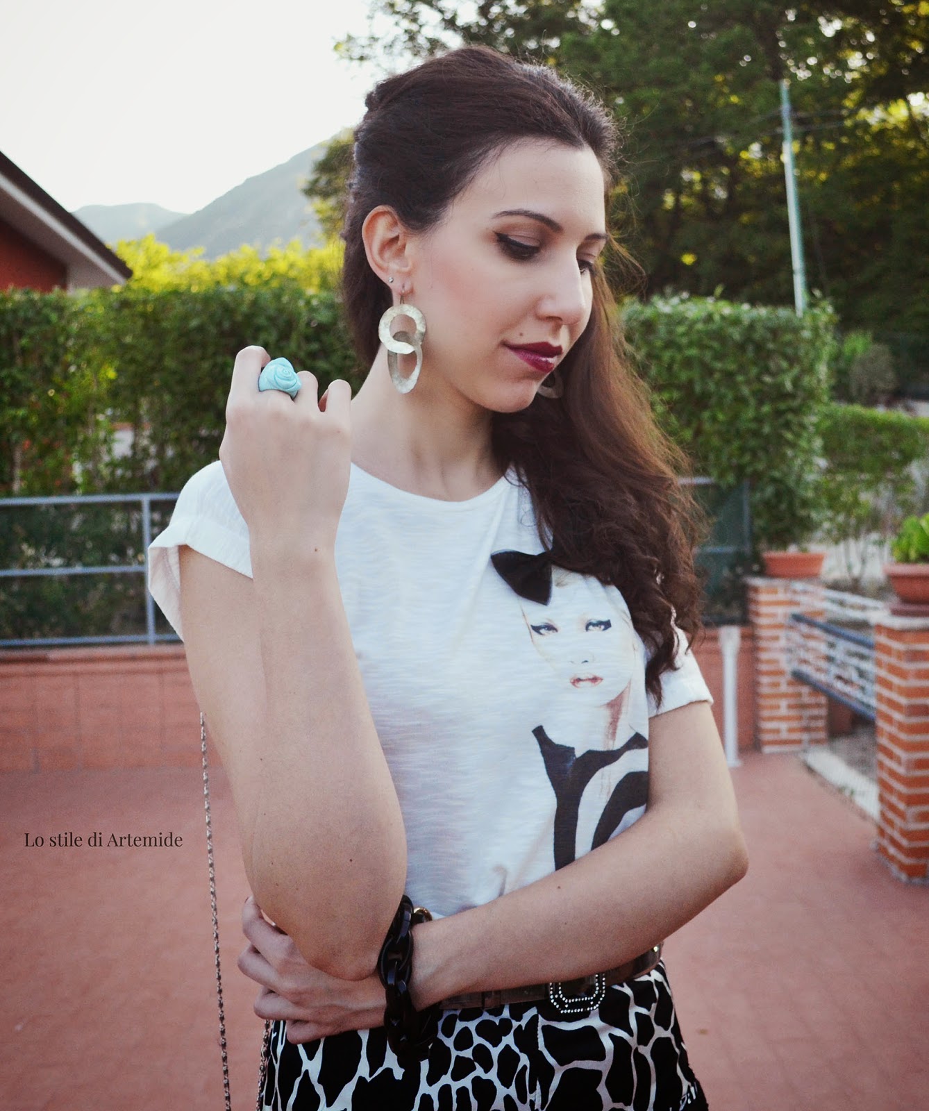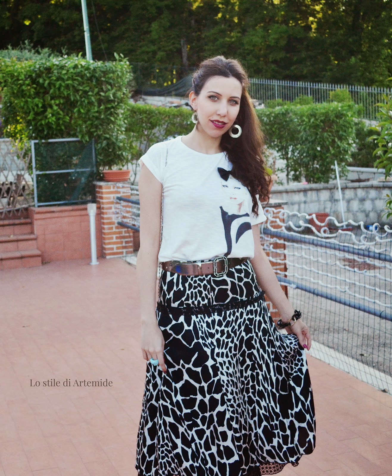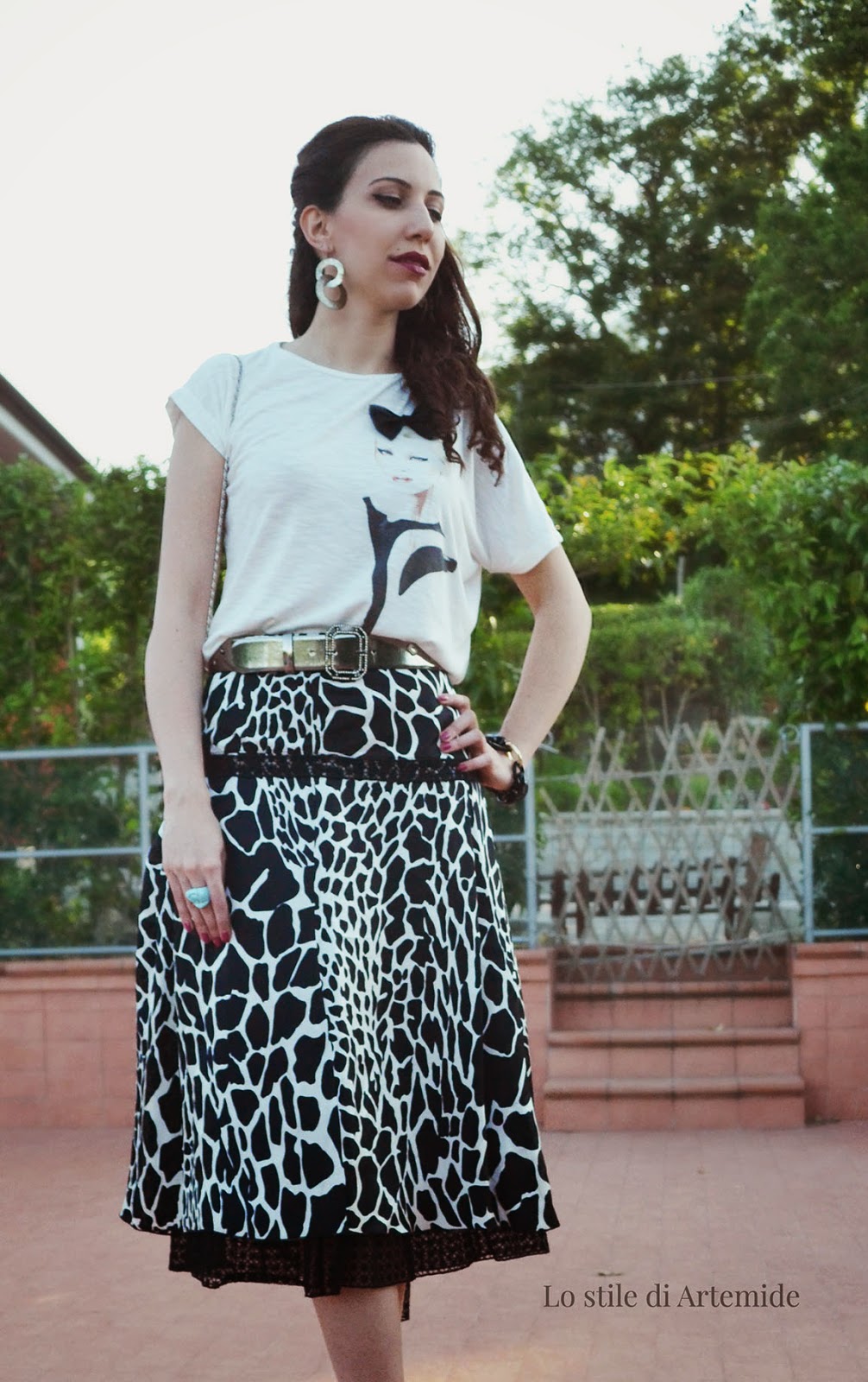 A grayscale outfit, which in digital images is called grayscale: black writing on white, made valued by silvery belt and earrings, that I bought several years ago from an African pitchman in Trastevere (Rome). He told me that in his country only noble women wore those flashy jewelry, they could afford metal and its forging.