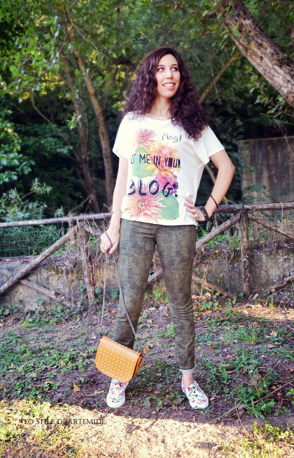 The colors are all here: orange and yellow like fruits, blue of tropical birds, green like big forest, hot pink and animalier prints that take us to those furthest hot lands. I’ve worn Sa.Ro t-shirt Honolulu with dark green jeggings (seen here too), my inseparable mustard bag, and slip on shoes with floral print.