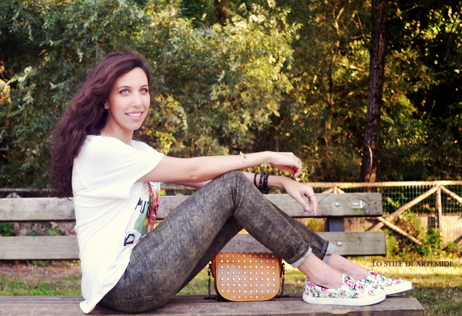 I colori ci sono tutti: l’arancio e il giallo di golosi frutti, l’azzurro degli uccelli tropicali, il verde delle grandi foreste, il fucsia e l’animalier che ci riportano anche solo con gli occhi a quei paesi lontani caldissimi. L’ho indossata con dei jeggings che si immergono completamente nella natura circostante (ce li avevo anche qui), la mia inseparabile borsa tascapane senape, e le slip on a stampa floreale.