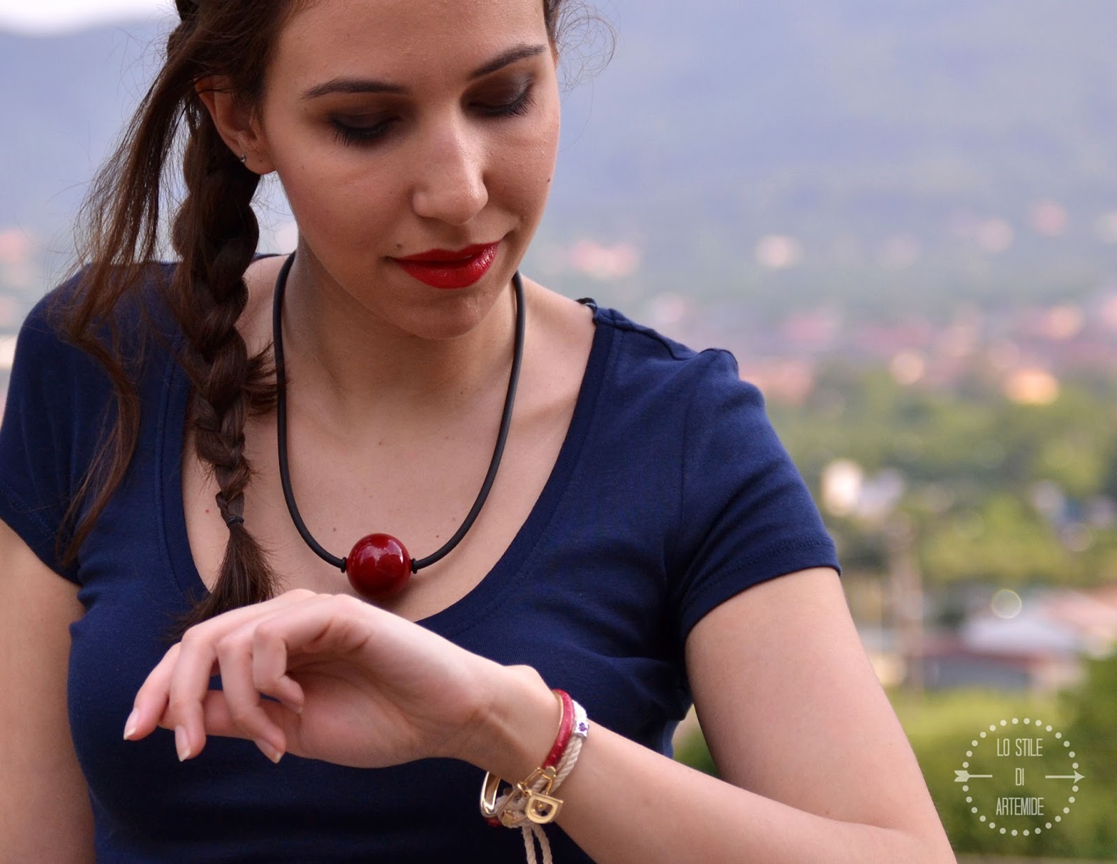 Lo ritroviamo nei miei accessori: la borsa in rafia rossa più capiente del solito, il bracciale in pelle a forma di fiore e il ciondolo con la bellissima pallina in vetro veneziano (vista anche qui).