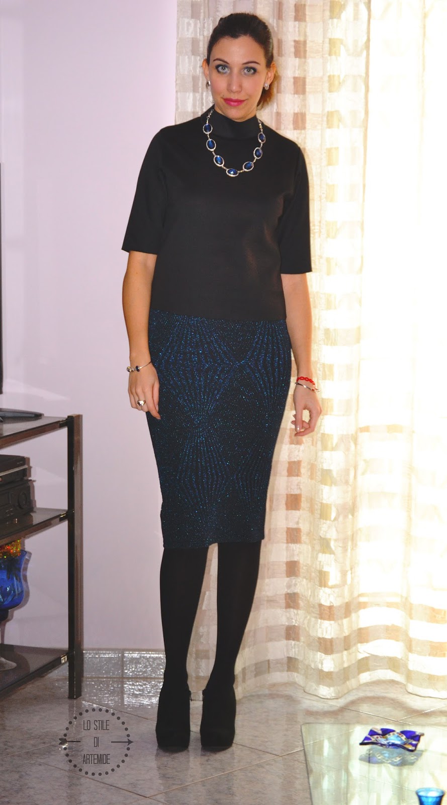 Quando ho visto questa gonna in lurex da Zara ho immaginato una facilissima equazione: Per me esiste l’equazione Capodanno=Brillare e quando ho visto questa gonna in lurex blu da Zara ho pensato di aver fatto centro. Una pencil skirt, ovvero una gonna a matita, alta sui fianchi e stretta sulla gamba. Quando si ha a che fare con un articolo luminoso e lavorato, meglio rimanere semplici nel resto del look, perciò ho optato per questa maglietta in tessuto lucido completamente nera con maniche a 2/3 e collo Perkins. Quando ZARA mi offre soluzioni di look che rimangono sui 50€ sono doppiamente felice: la gonna infatti viene solo 17,95€ e la maglietta 14,95€.
