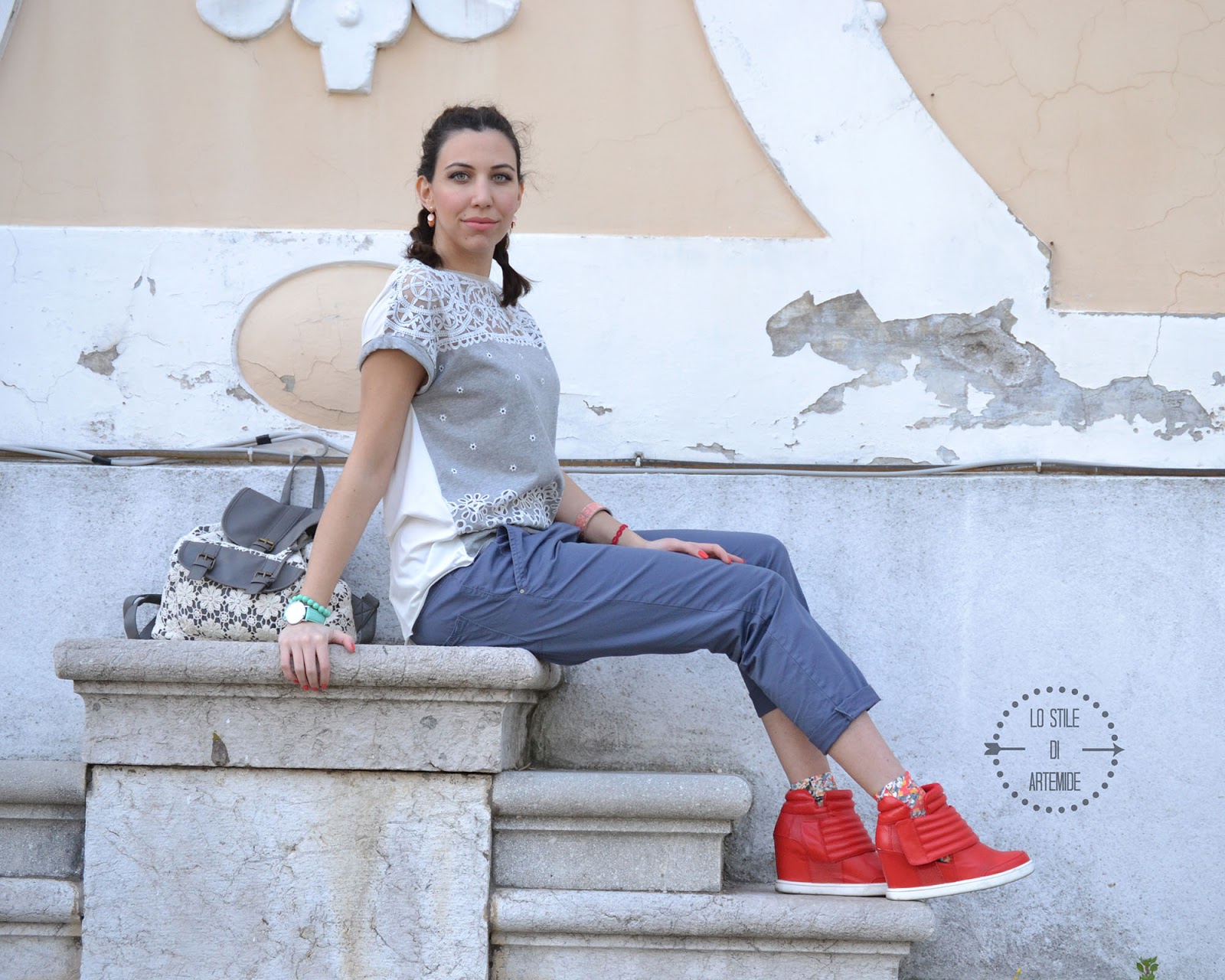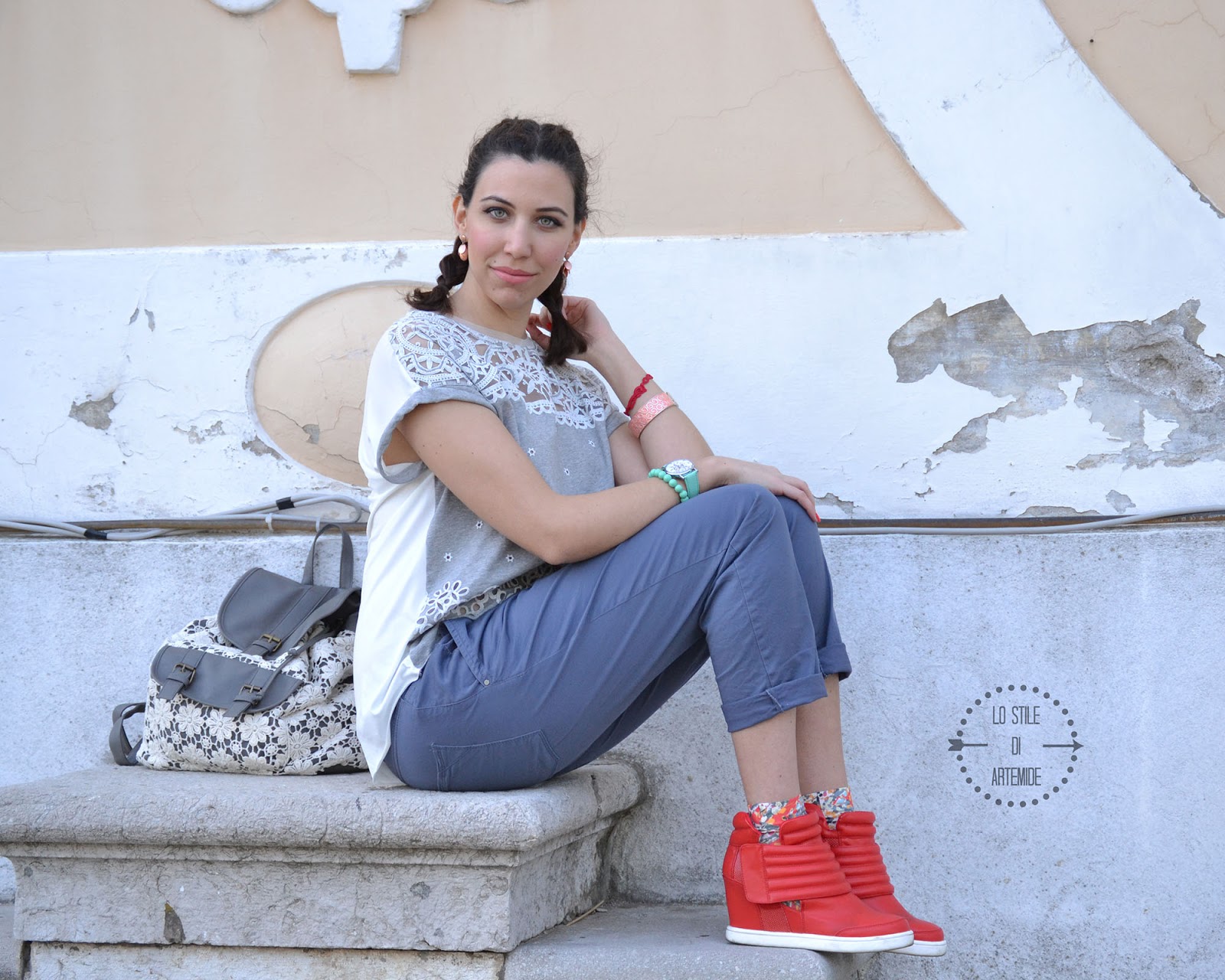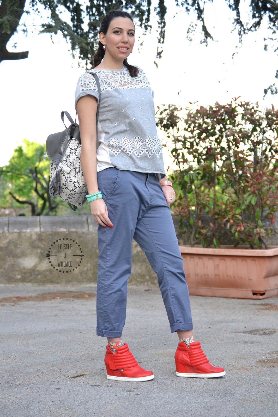 I miei li ho presi da Zuiki, ed insieme alla t-shirt ZARA creano un look dai toni chiari e dallo stile rilassato, dove sul grigio spicca il rosso papavero delle sneakers alte e dello smalto. Uno zainetto Claire’s con decorazioni in crochet e fa subito teenager. Ma volete mettere la comodità del backpack che è tornato di moda anche per questa estate? Che poi ti dimentichi che la tua borsa ce l’hai dietro la schiena – e non sulla spalla – e ti senti molto più leggera e rilassata, insomma…in perfetto stile mindfulness!